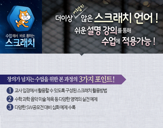 | 학습개요 | 본 연수에서는 초등학생 대상의 SW수업을 위한 스크래치 프로그램의 사용방법을 교과과정과 연계하여 소개하고 있습니다. 학습은 기본 블록들의 활용법, 응용 프로젝트 제작(응용 프로그램, 미디어아트, 게임, 스토리텔링 애니메이션) 등을 다양한 컨텐츠를 만들면서 익힐 수 있도록 구성되어 있습니다. 스크레치 프로그램은 학생들이 논리적이며 창의적인 사고를 키우고 능동적인 문제해결력을 키우는 프로그램으로 콘텐츠에서 제공하는 따라하기와 퀴즈, 그리고 실습은 선생님이 학생들과 함께 프로그래밍을 보다 쉽게 익힐 수 있는 기회를 제공할 것입니다. 직접 교육현장에서 학생들을 지도한 강사들의 경험을 바탕으로 학교현장에서 중요시하는 내용과 다양한 작품을 만들다보면 학생들도 흥미롭게 SW교육에 참여할 수 있을 것입니다. | ||