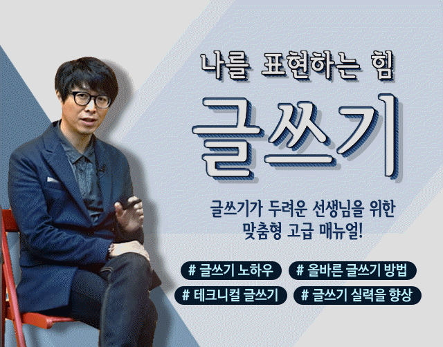 | 학습개요 | 소셜 네트워크의 발달로 말만큼이나 글로써 소통하는 것이 중요해지고 있습니다. 이러한 패러다임의 변화로 글쓰기의 중요성이 점차 강조되고 있습니다. 해당 과정 연수를 통해 교사 스스로 글쓰기에 대한 거부감을 없애며 더 좋은 글을 쓰는 방법과 노하우를 전달하고자 합니다. 또한, 다양한 실습 주제를 바탕으로 수업에서 활용 가능한 방법을 제시하고 있습니다. | ||