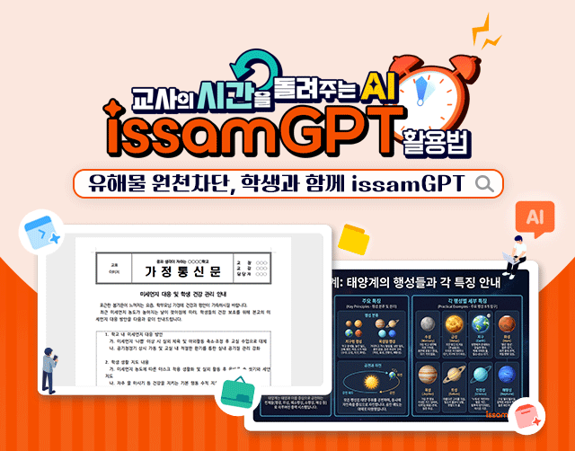 ● 아울러 클래스 리포트와 학생 상세 리포트를 활용하여 학생의 AI 활동 결과를 체계적으로 기록하고 분석하는 방법을 익히고, 업무경감 기능을 통해 공문 요약부터 가정통신문·보고 공문 생성까지 반복적인 행정 문서 처리를 자동화하는 방법을 배울 수 있습니다. |