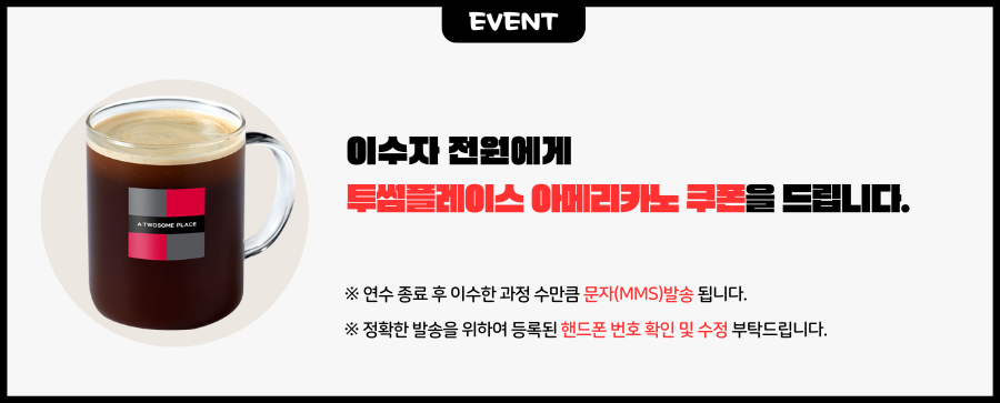 · 이수자 전원에게 투썸플레이스 아메리카노 쿠폰을 드립니다. · 정확한 발송을 위하여 핸드폰 번호 확인 및 수정 부탁드립니다.