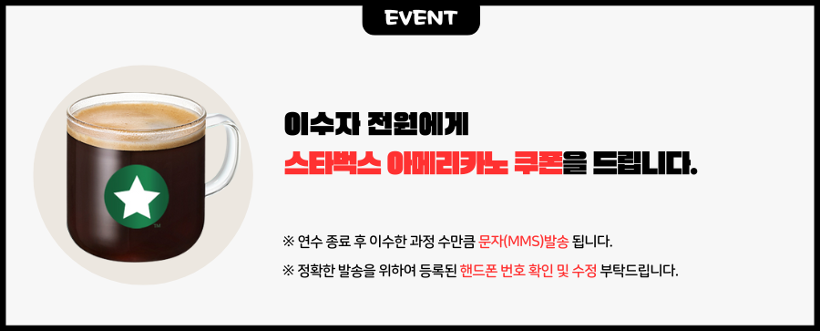 · 이수자 전원에게 스타벅스 아메리카노 쿠폰을 드립니다. · 정확한 발송을 위하여 핸드폰 번호 확인 및 수정 부탁드립니다.